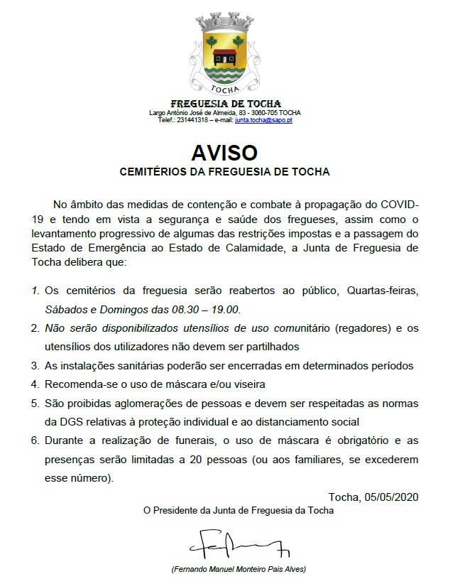 ABERTURA DOS CEMITÉRIOS DA FREGUESIA DE TOCHA